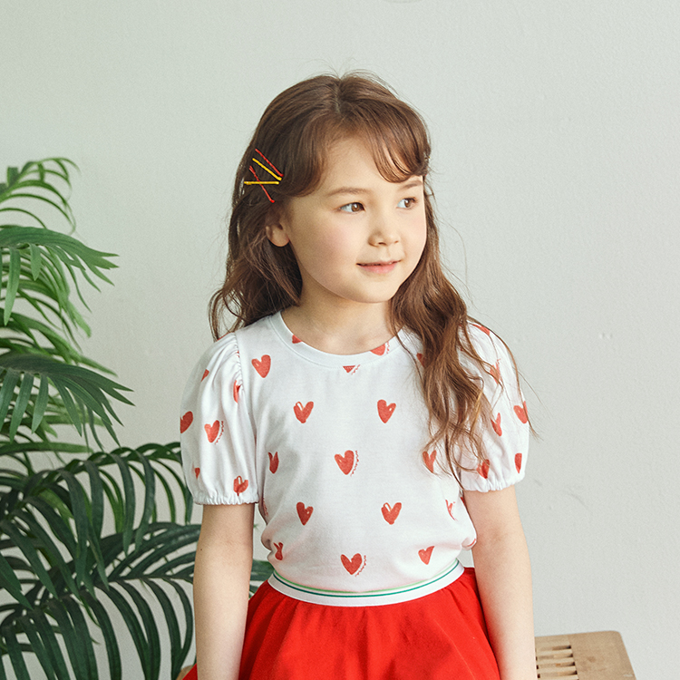 하트 패턴과 봉긋한 퍼프소매가 사랑스러운 티셔츠입니다.